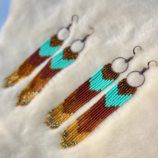 Beaded Hoop Fringe Earrings Copper Mint Tones