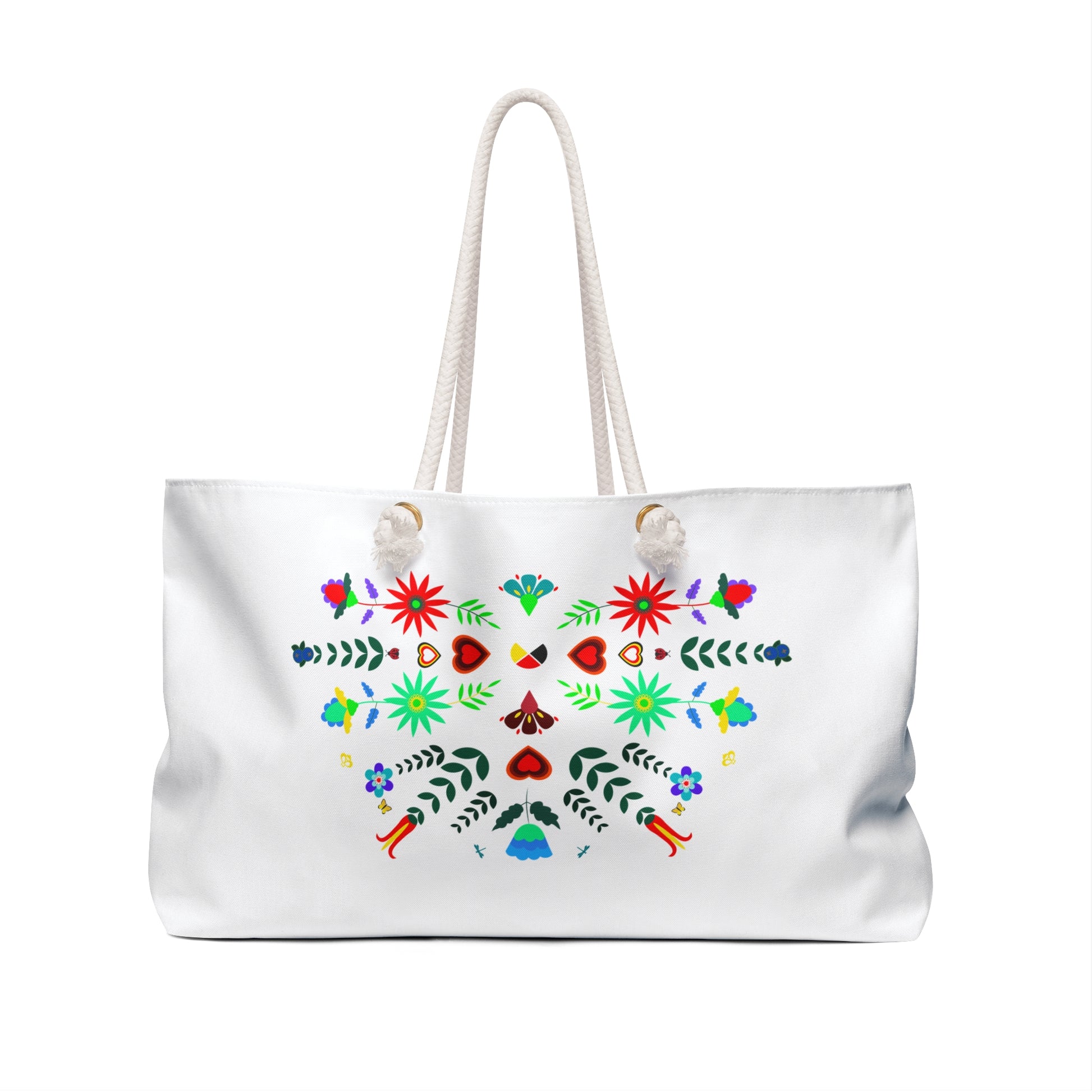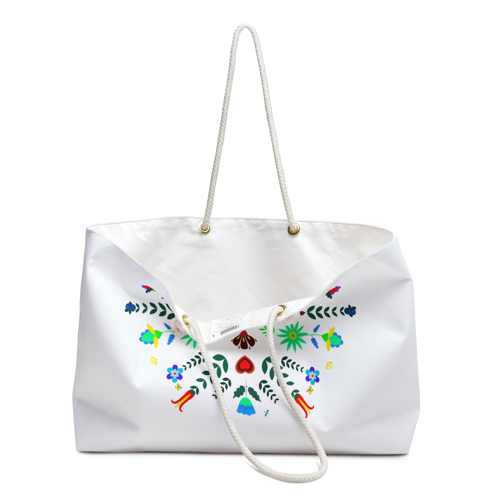Our oversized Weekender Tote is perfect for your weekend at the beach or in town. The wide-mouthed, durable bag holds a generous amount of personal items and is easily held by its thick rope handles. .: 100% Spun Polyester .: T-bottom .: Cream sheeting interior lining .: One size: 24" x13" (60.9 cm x 33 cm) .: NB! Size tolerance 0.75" (1.9 cm)) .: Assembled in the USA from globally sourced parts
