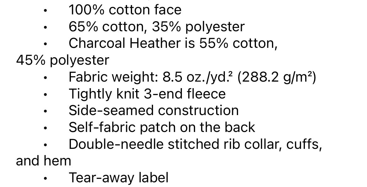 • Charcoal Heather is 55% cotton, 45% polyester