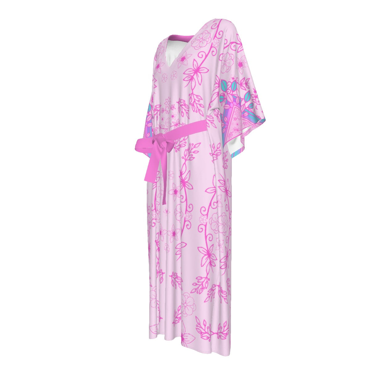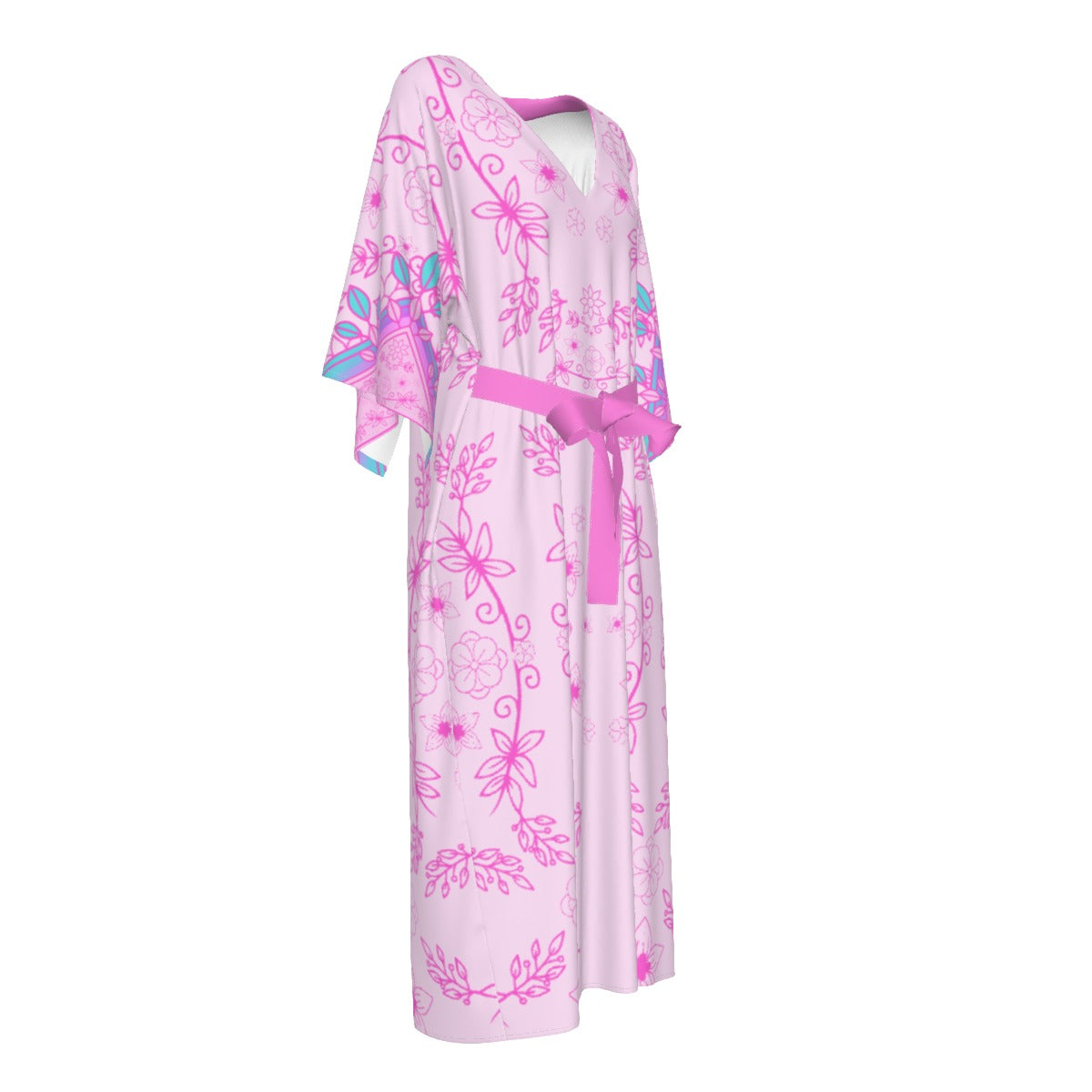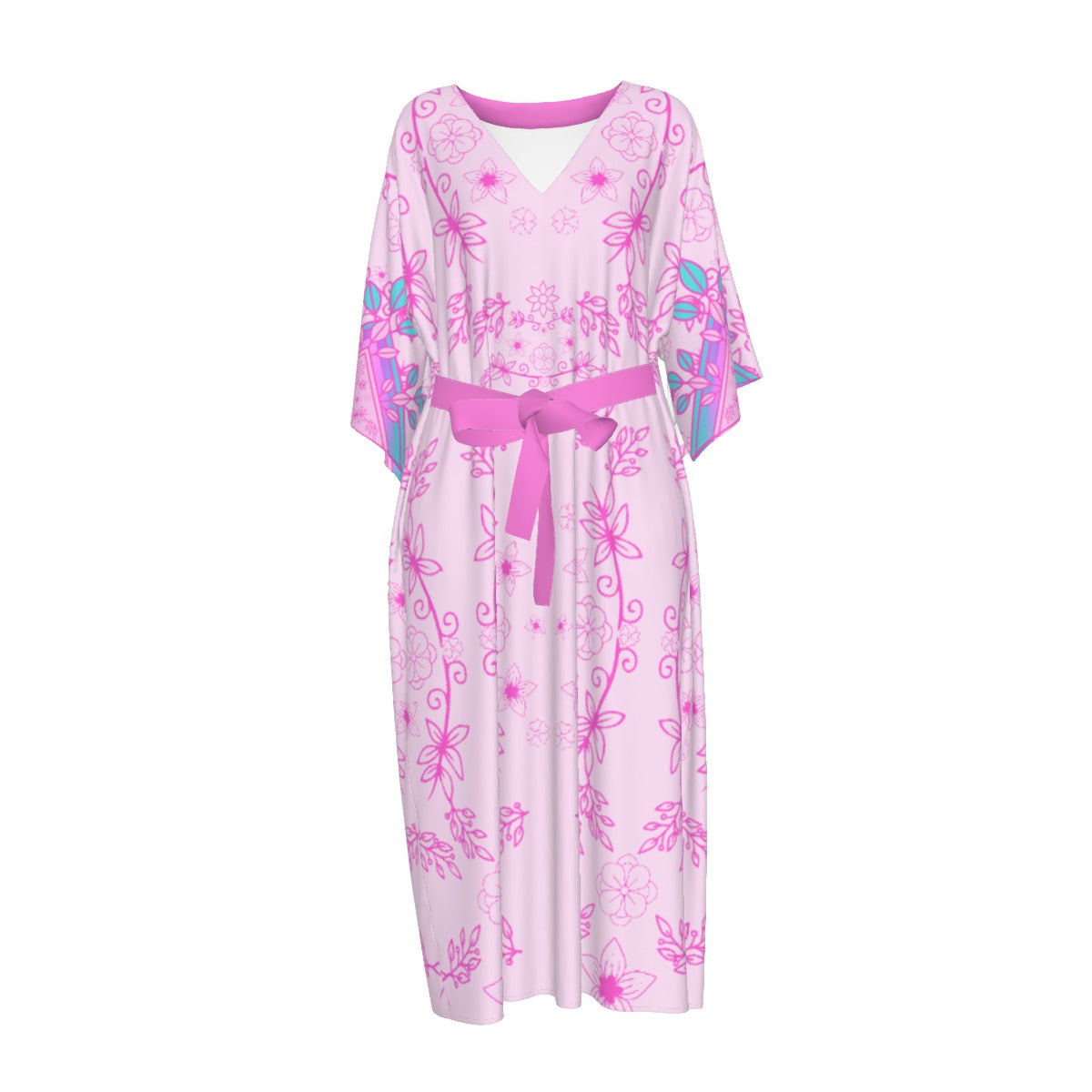 Flowy Long Silky Dress, light weight and flowy sleeved. Features a front tie. Made in China, but designed in Canada, the fabric boasts a 95% polyester and 5% spandex blend that offers mid stretch. For care, simply machine wash with like colors, avoid bleaching, tumble dry on low, and refrain from ironing or dry cleaning.