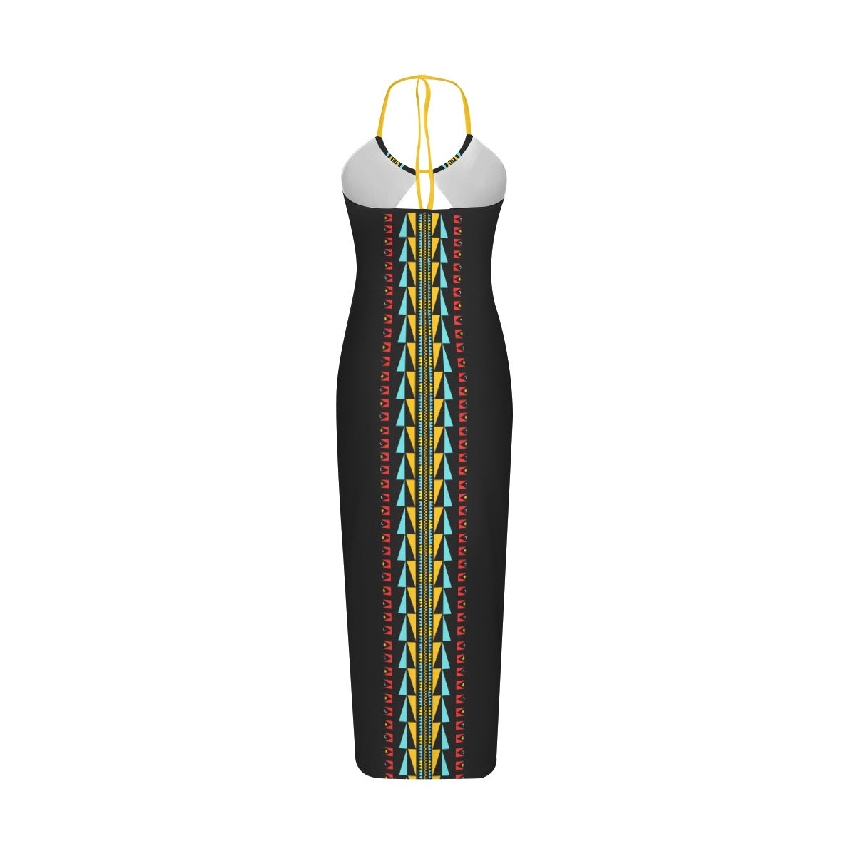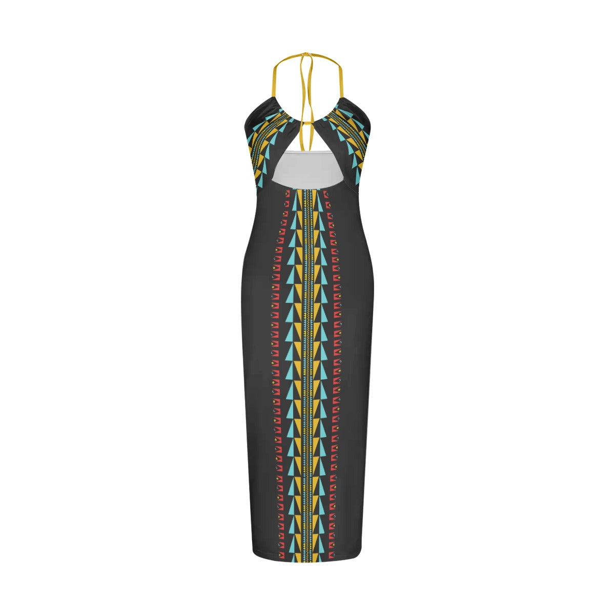 A dress with an innovative crossed cami configuration and functional tie-up detail. The figure-defining fabric delivers a polished, contoured aesthetic while honoring traditional native print artistry.