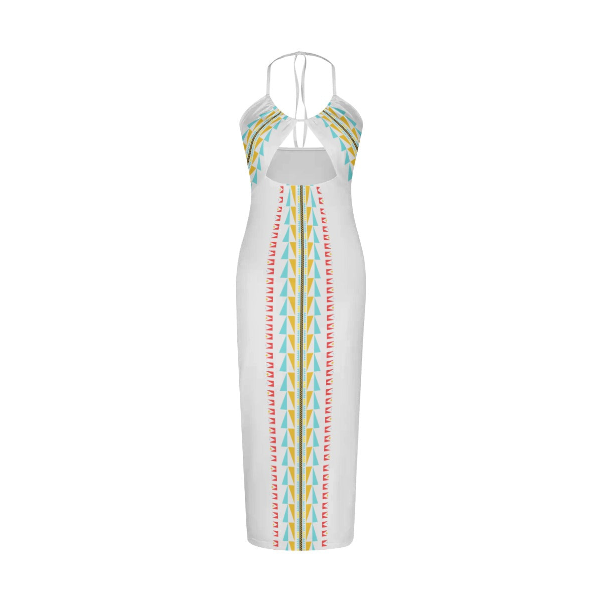 A dress with an innovative crossed cami configuration and functional tie-up detail. The figure-defining fabric delivers a polished, contoured aesthetic while honoring traditional native print artistry.