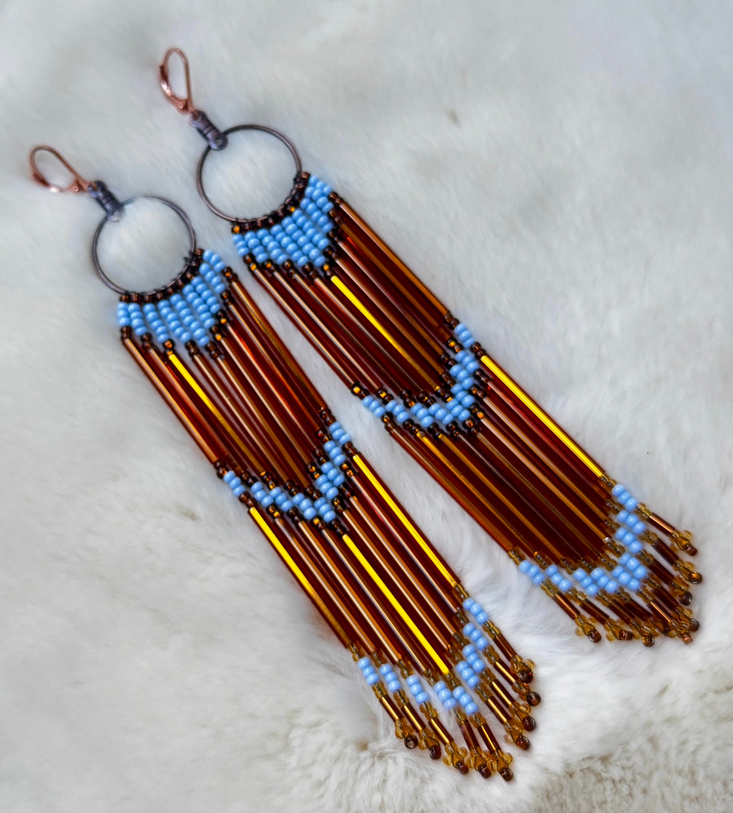 Beautiful Dangle Hoop earrings. Made with Czech Beads of Silver Lined Copper beads with accent of periwinkle on 20 MM on antique Hoops with Cooper clasps.