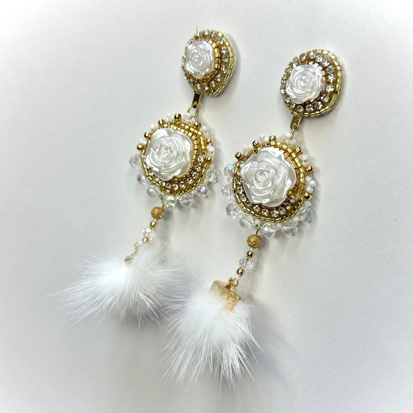 Dainty Mink Fur Pom Poms 30MM Roughly with Gold plated Clasps and findings. Crystal Trim and delica beads of multiple golds with Swarovski Crystal Trim
